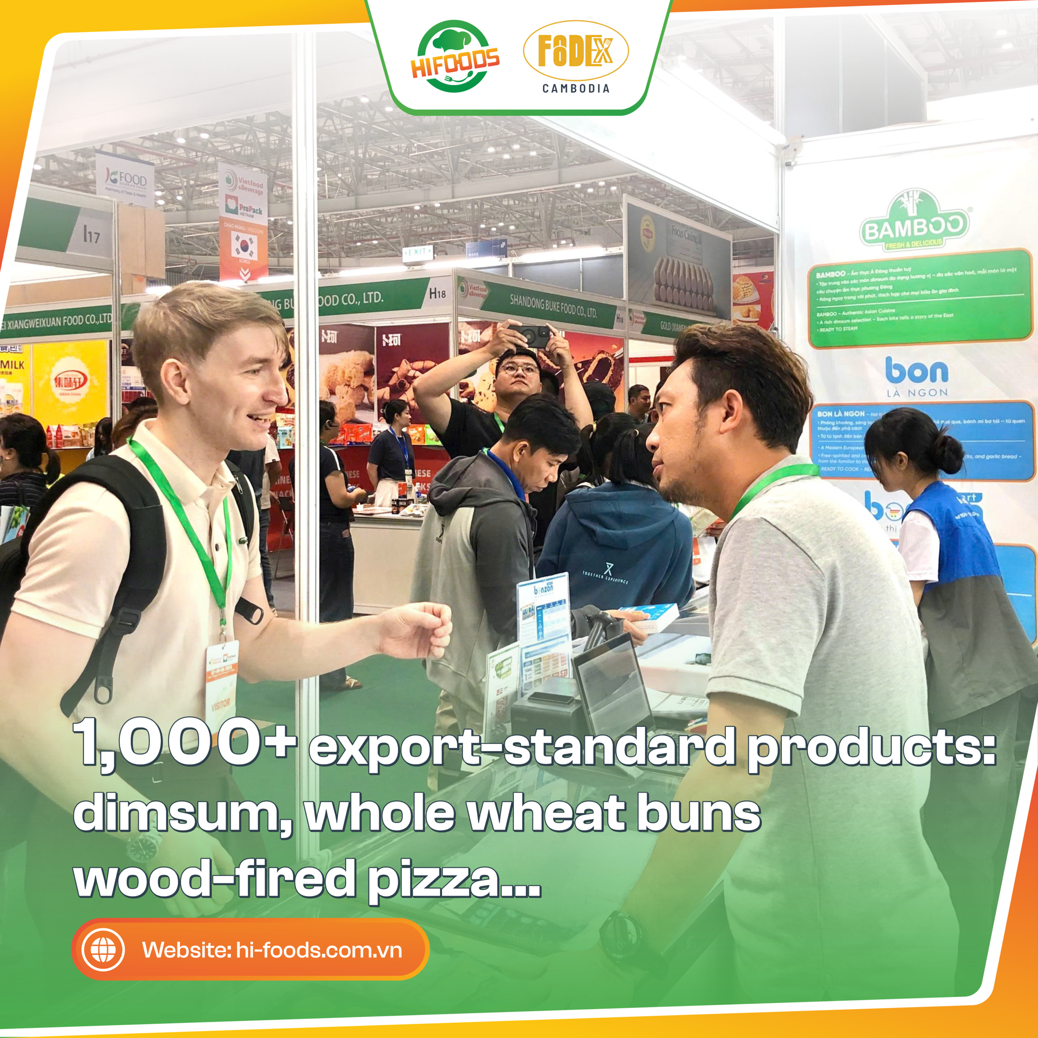 HI-FOODS trưng bày hơn 1000 sản phẩm, bao gồm dimsum, bánh bao nguyên cám, pizza nướng than củi, há cảo, nem, bánh cuốn, và nhiều dòng sản phẩm tiện lợi khác. Tất cả đều đáp ứng tiêu chuẩn an toàn quốc tế, phù hợp với nhiều thị trường khó tính như Nhật Bản, Hàn Quốc, EU và Úc.R&D theo nhu cầu riêng biệt