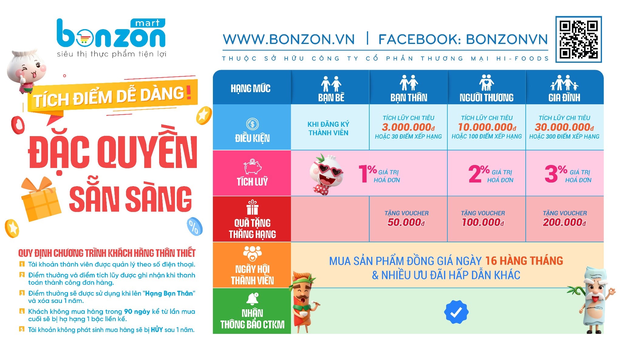 Điểm thưởng và điểm tích lũy được ghi nhận khi thanh toán đơn hàng từ 100.000vnđ khi mua sắm trực tiếp tại hệ thống Siêu thị BONZON, Fanpage, Website bonzon.vn, Zalo & hotline: 0904 400 700
