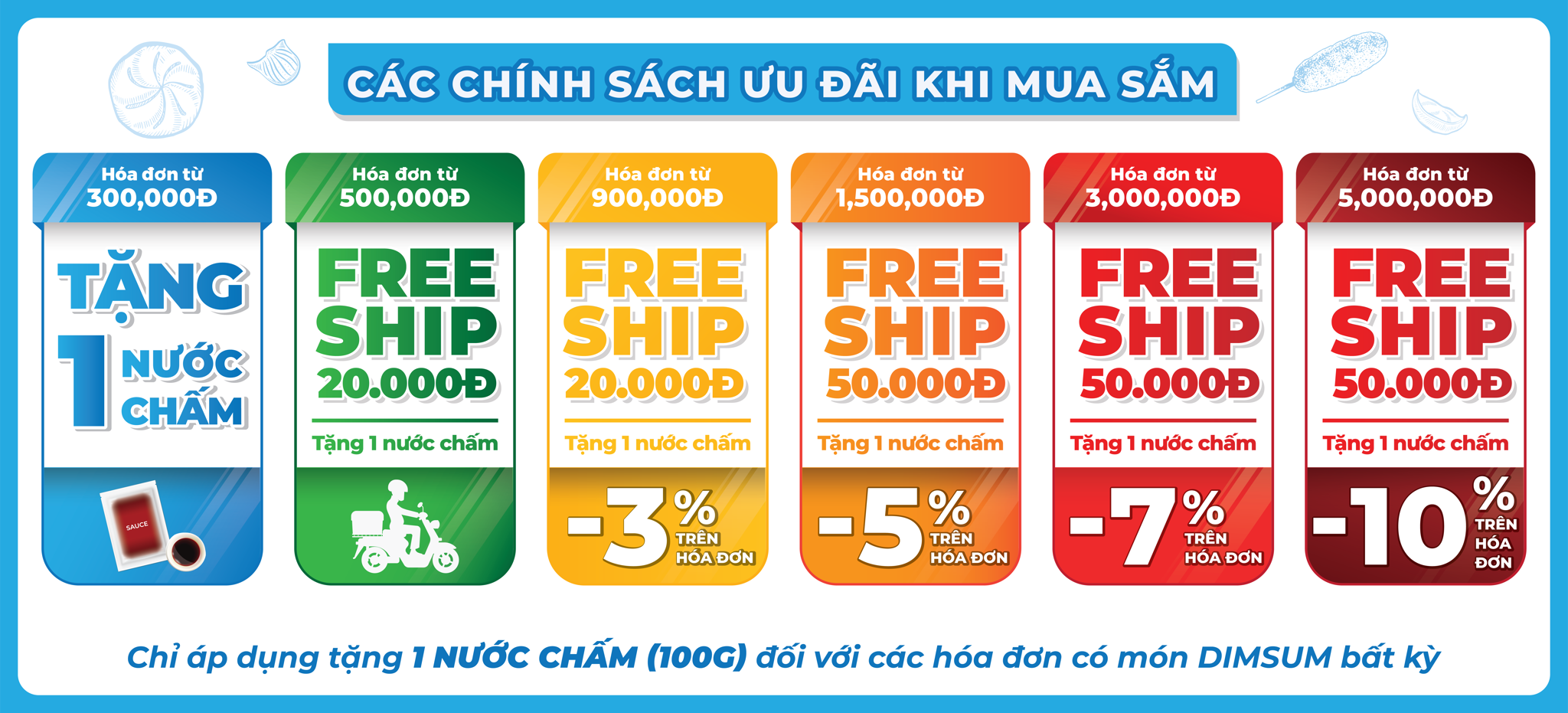 • Hóa đơn từ 3.000.000đ - giảm 7% - hỗ trợ phí ship 50.000đ - tặng 01 nước chấm (hóa đơn có món Dimsum)