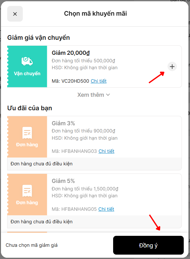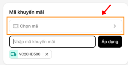 Sau khi đã chọn mua các sản phẩm cần thiết và hoàn tất thông tin giao hàng, chọn mã khuyến mãi của hệ thống