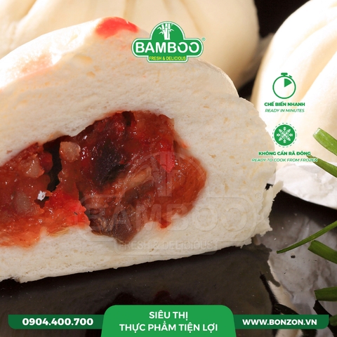 ĐỊNH LƯỢNG: 30g/cái x 6 cái/gói THÀNH PHẦN: Bột bánh bao, thịt xá xíu, thịt heo, mỡ heo, hành tím, gia vị, dầu nành, nước, men bánh bao, bột năng MÔ TẢ SẢN PHẨM: Bánh bao có phần vỏ mềm xốp. Nhân bánh không bị khô với phần sốt thấm đều cùng với hương vị thơm ngon của rau củ và gia vị đặc trưng của xá xíu HƯỚNG DẪN CHẾ BIẾN: Không rã đông. Hấp cách thủy ở nhiệt độ 100°C khoảng 6-7 phút BẢO QUẢN: Ở nhiệt độ -18°C hoặc trong ngăn đá tủ lạnh. Không đông lại sau khi đã rã đông HSD: 18 tháng