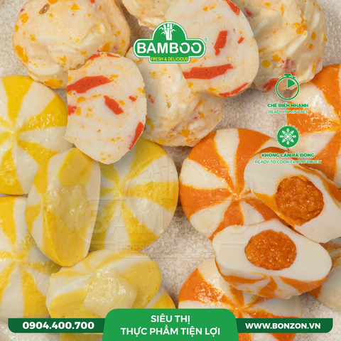 - Cá viên nhân phô mai: Cá, phô mai, bột năng, đậu nành, bột trắng trứng, gia vị, màu beta-carotene
