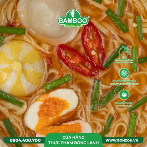 THÀNH PHẦN: Mì, cá viên nhận phô mai, cá viên nhân trứng cá chuồn, há cảo tôm thịt hình sò điệp, hành lá, nước súp lẩu thái