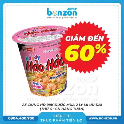 ĐỊNH LƯỢNG: 67g THÀNH PHẦN: Bột mì, tinh bột khoai mì, shortening, gia vị MÔ TẢ SẢN PHẨM: Sợi mì vàng dai ngon hòa quyện trong nước súp tôm chua cay Hảo Hảo chua ngọt, đậm đà thấm đẫm từng sợi mì sóng sánh cùng hương thơm quyến rũ ngất ngây. Mì Handy Hảo Hảo vị tôm chua cay ly 67g là lựa chọn hấp dẫn không thể bỏ qua đặc biệt là cho những ngày bận rộn cần bổ sung năng lượng nhanh chóng HƯỚNG DẪN CHẾ BIẾN: Mở nắp ly đến vạch có mũi tên, cho các gói gia vị vào ly. Chế nước sôi đến vạch của ly, đậy nắp lại và chờ 3 phút. Trộn đều và dùng được ngay BẢO QUẢN: Bảo quản nơi khô ráo, thoáng mát, tránh ánh nắng trực tiếp. Không để gần hóa chất hoặc sản phẩm có mùi mạnh HSD: 5 tháng
