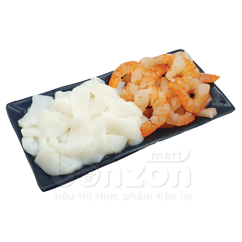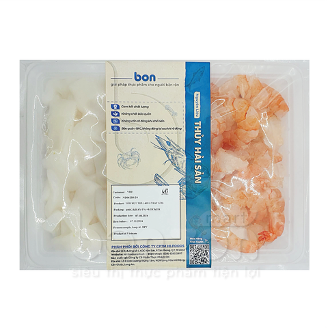 ĐỊNH LƯỢNG: 400g THÀNH PHẦN: Tôm sú, mực Peru MÔ TẢ SẢN PHẨM: - Sản phẩm kết hợp của Tôm sú và mực - Sản phẩm có màu đỏ tự nhiên của tôm, thịt dai, giòn, ngọt. Mực có màu trắng ngà, độ dai vừa phải, vị ngọt tự nhiên - Hỗ trợ cho bữa ăn nhanh, tiện lợi, tiết kiệm thời gian cho gia đình - Cấp đông hiện đại theo công nghệ IQF, sản phẩm được cấp đông nhanh chóng, giúp giữ được hương vị, kết cấu và giá trị dinh dưỡng của sản phẩm, đảm bảo sản phẩm lạnh sâu và tươi ngon, hạn chế được vi sinh vật HƯỚNG DẪN CHẾ BIẾN: - Rã đông tự nhiên trước khi sử dụng - Chế biến các món lẩu, soup, nướng, xào, các món ăn theo sở thích BẢO QUẢN: Ở nhiệt độ -18°C hoặc trong ngăn đá tủ lạnh. Không đông lại sau khi đã rã đông HSD: 18 tháng